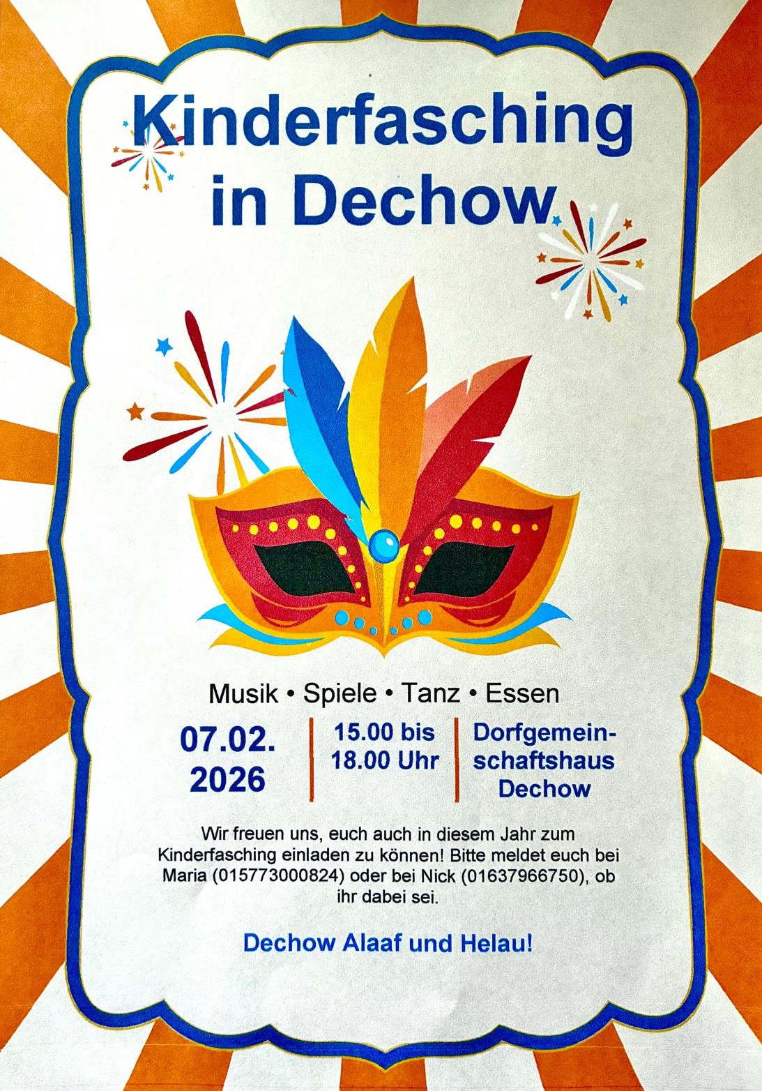 Wir veranstalten im Dorfgemeinschaftshaus einen fröhlichen Faschingsnachmittag: